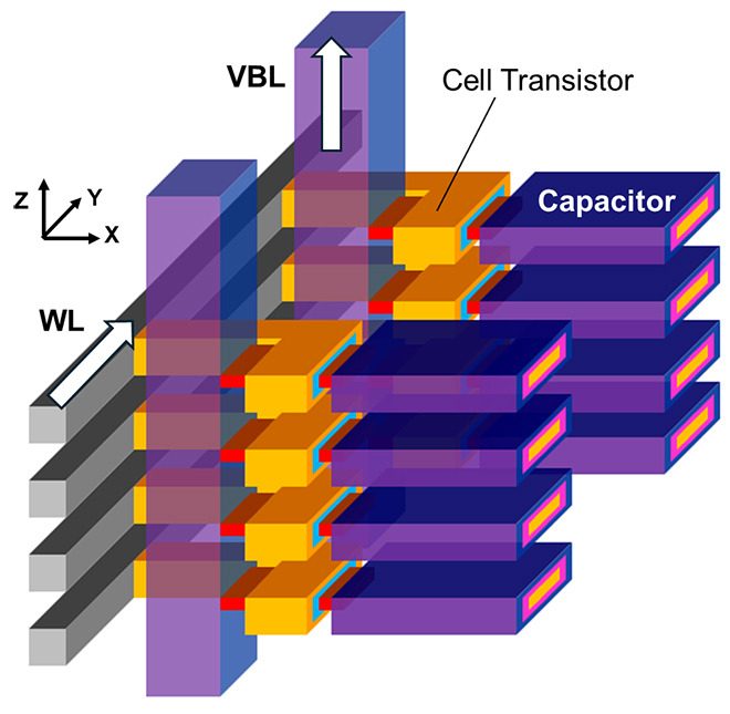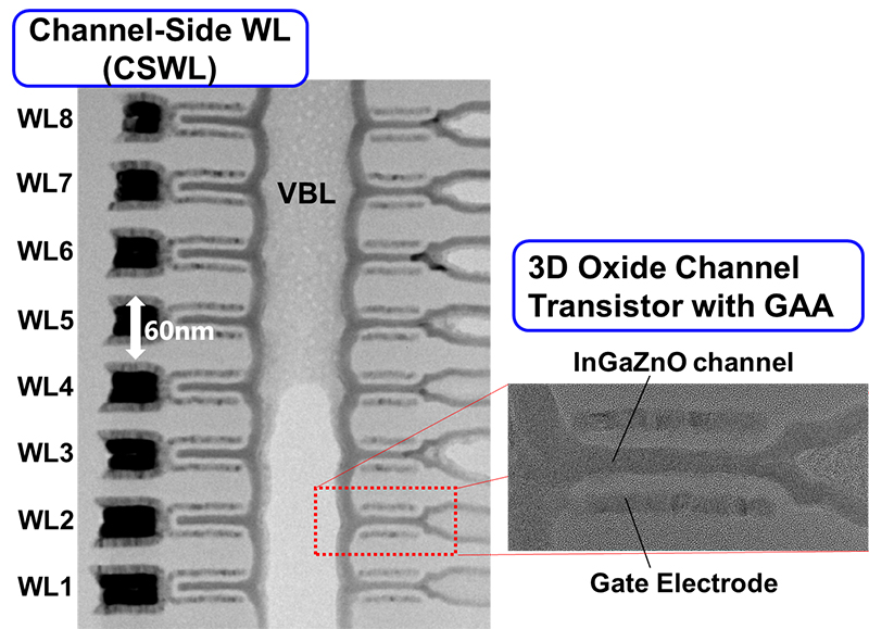 此新技術堆疊成熟的氧化矽及氮化矽膜,並以氧化物半導體 (InGaZnO) 取代氮化矽區,以同時形成水平堆疊電晶體的垂直層。我們還推出了一種新型 3D 記憶體單元結構,能夠擴展垂直間距。這些製程和結構預期將能克服實現記憶體單元 3D 堆疊的成本挑戰。